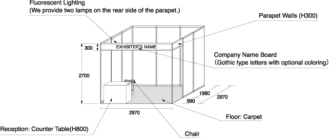Back and side panels, fascia with exhibitor's name, carpet, information counter, fluorescent lights(2), main