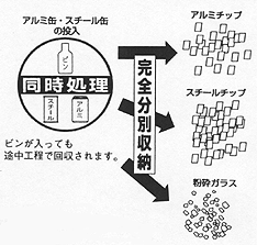 チップ状にした後、アルミ・スチールを完全に分別収納します。ビンが混入しても途中の行程で回収されます。 |