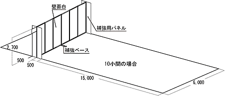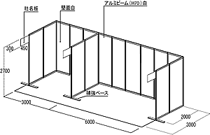 奥行き3m×間口3m×高さ2.7m 内寸法2.97m 奥行きのソデは2mとなります。 角小間はL型になり、一方のソデはつきません。 社名板(45cm×30cm) |