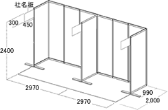 小間スペース、テーブル、後壁面・両側壁面(システムパネル)及び社名板。角小間は片方(右か左)の袖パネルはつきません。 |
